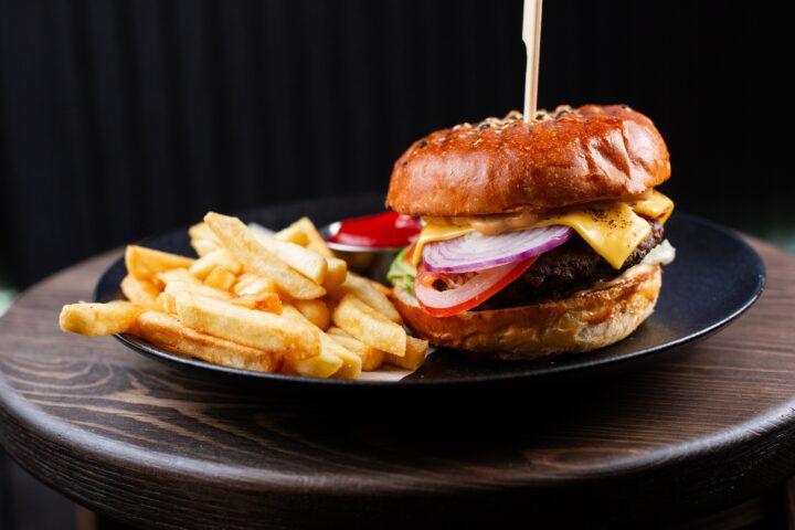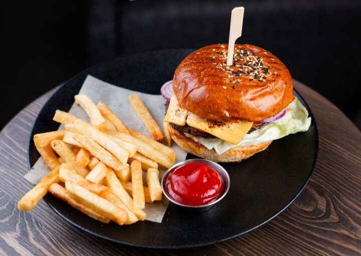 Подаётся с картофелем фри и кетчупом.