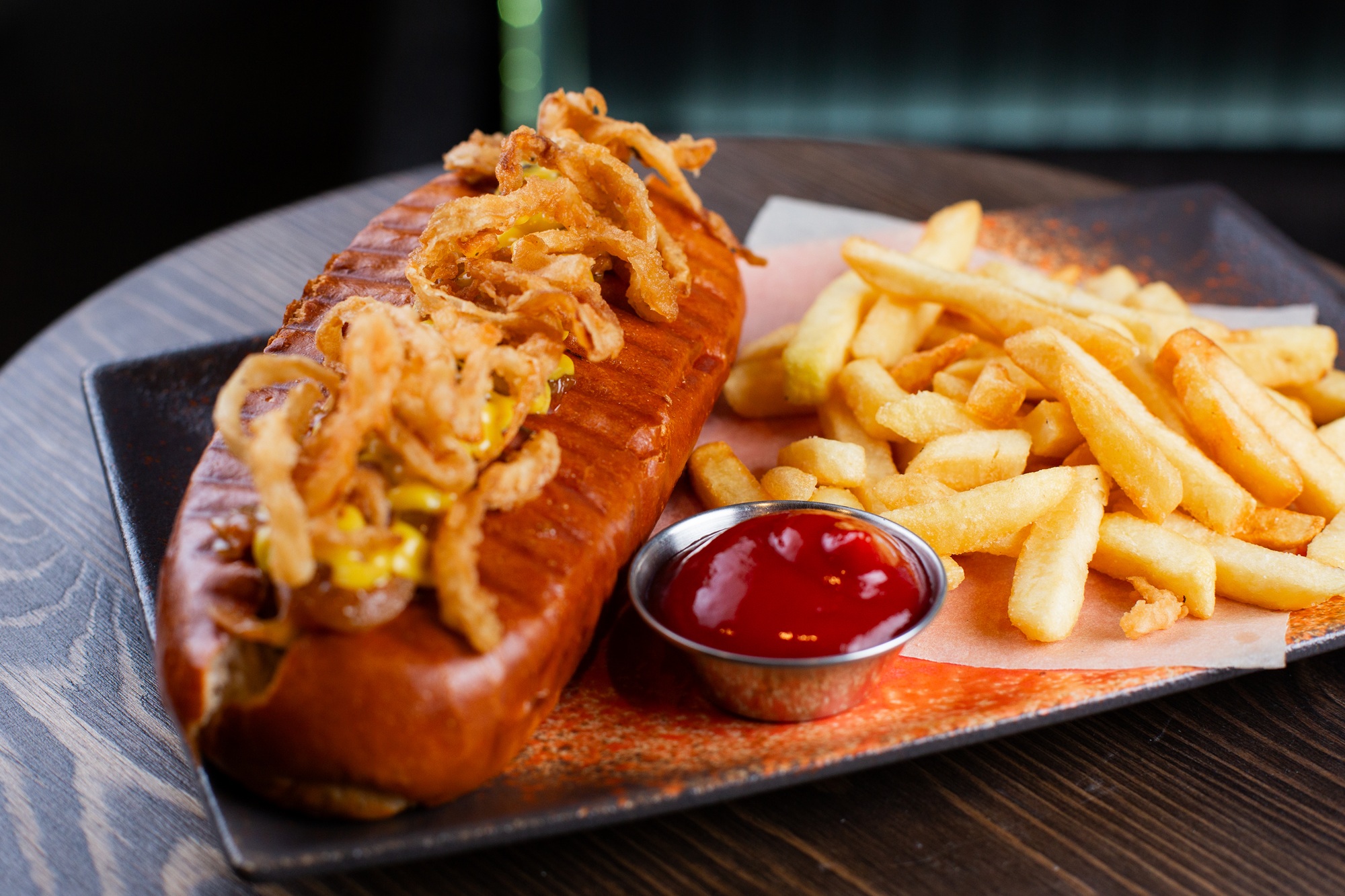 Подаётся с картофелем фри и кетчупом.