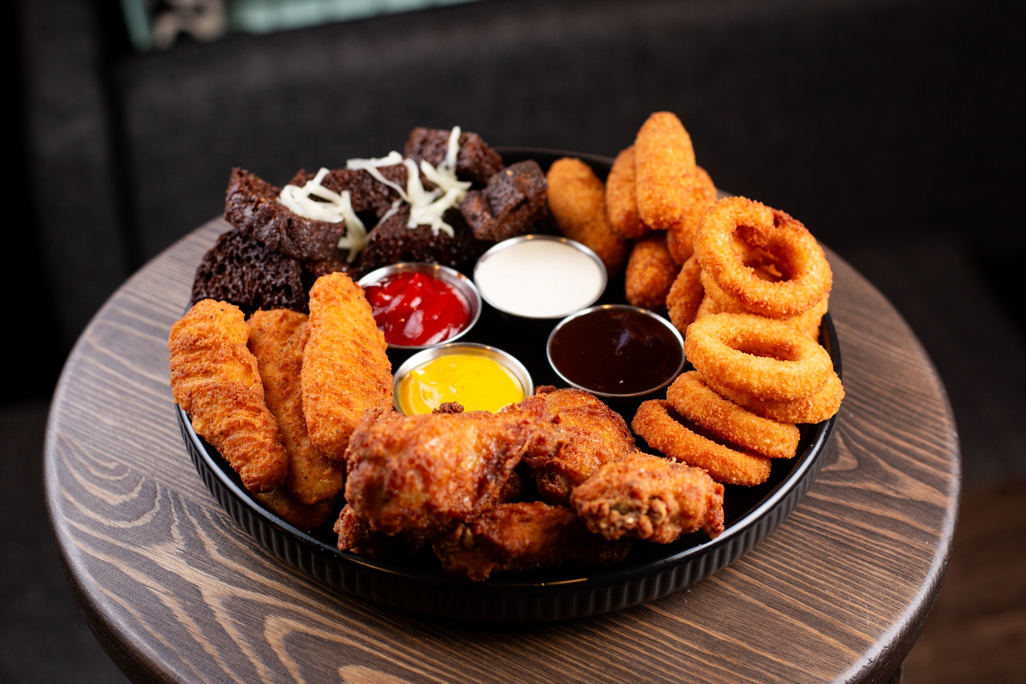 Сырные палочки, хлебные гренки, луковые кольца, крылья, стрипсы. Соусы: тартар, BBQ, кетчуп, горчичный.