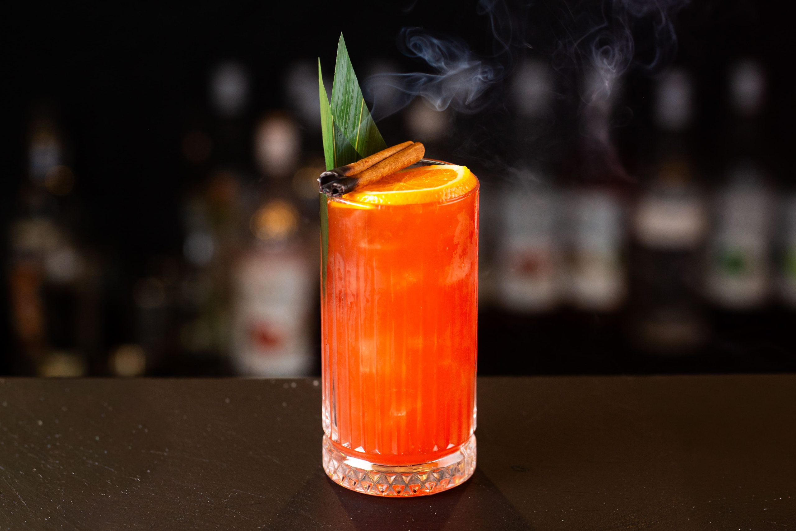 Состав: — Белый, тёмный, пряный ром — Настойка вишня — Сиропы: гренадин, абрикос — Соки: ананас, апельсин — Лимонный фреш